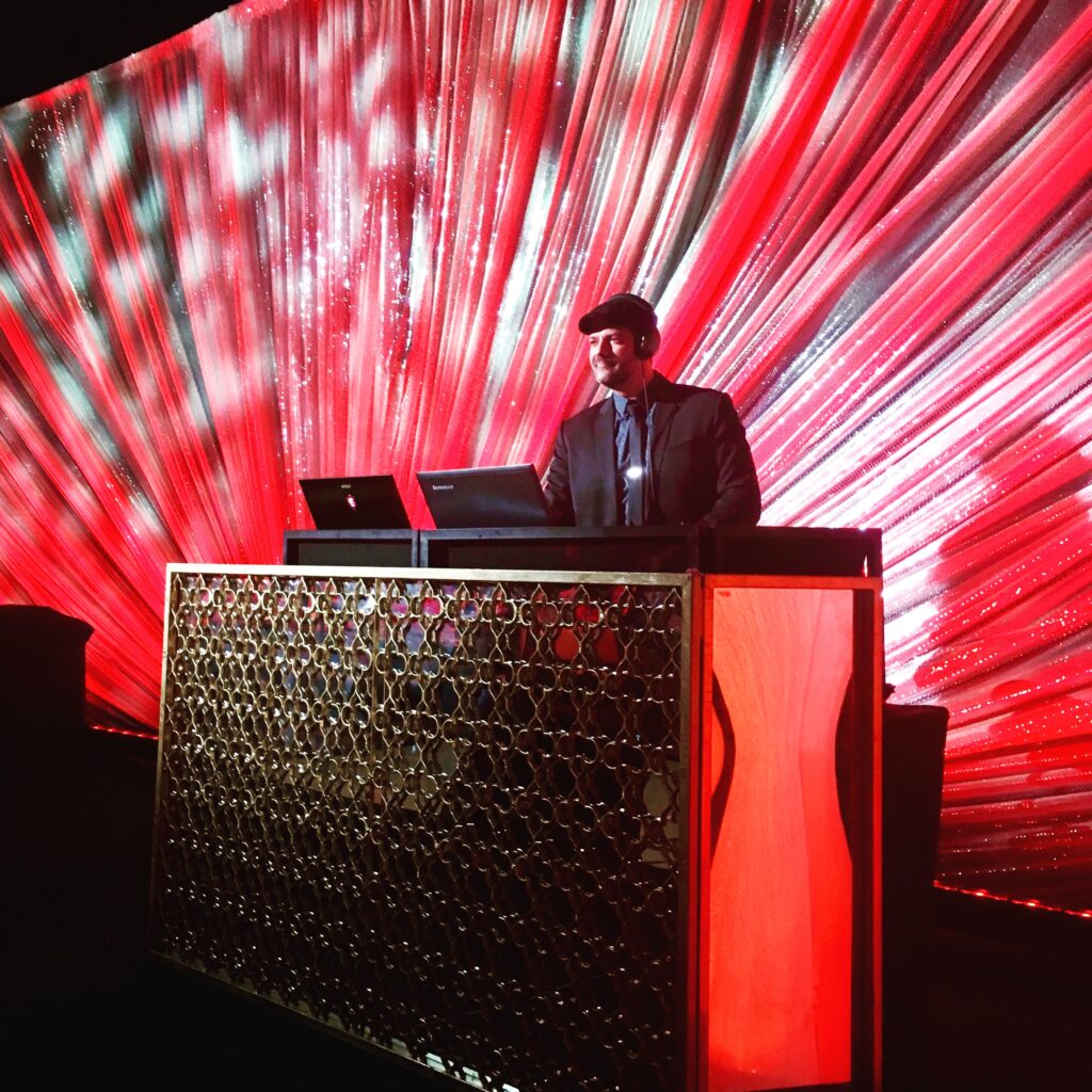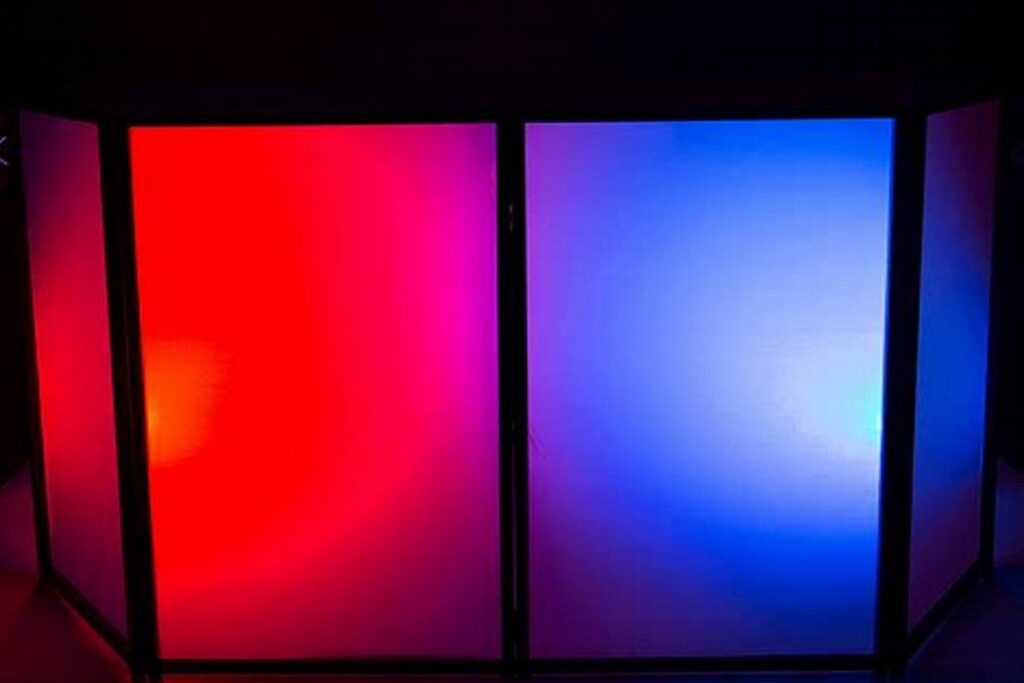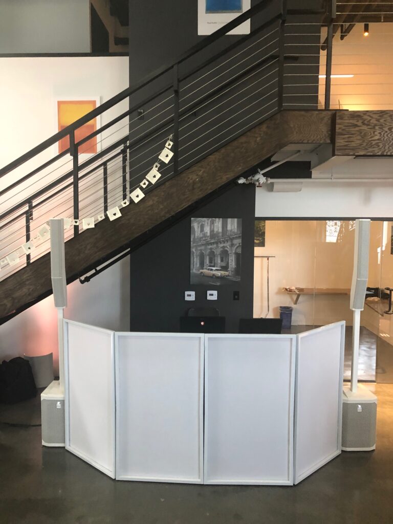 By using a sleek white fabric façade, we can backlight it with vibrant LED colors to create a striking visual effect. This simple upgrade adds energy, enhances the atmosphere, and makes the DJ station stand out as a true focal point.