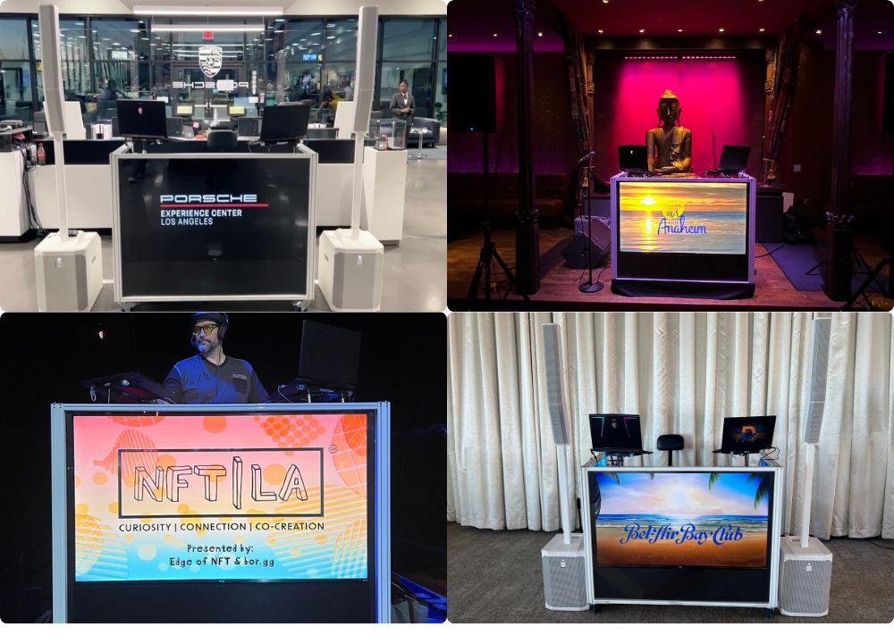 Our custom LCD Video DJ Booth takes event entertainment to the next level. With a video screen on the front and interchangable side panels, you can showcase your company logo, custom monogram, or eye-catching visuals that instantly grab attention. Using the built-in video switcher, we can seamlessly transition between multiple sources—whether it’s music videos, dynamic motion graphics, karaoke, or even our brand-new game show experience. Plus, we include a basic monogram or logo design in the upgrade price, saving you the added cost of a separate projection while delivering a truly unforgettable visual impact.